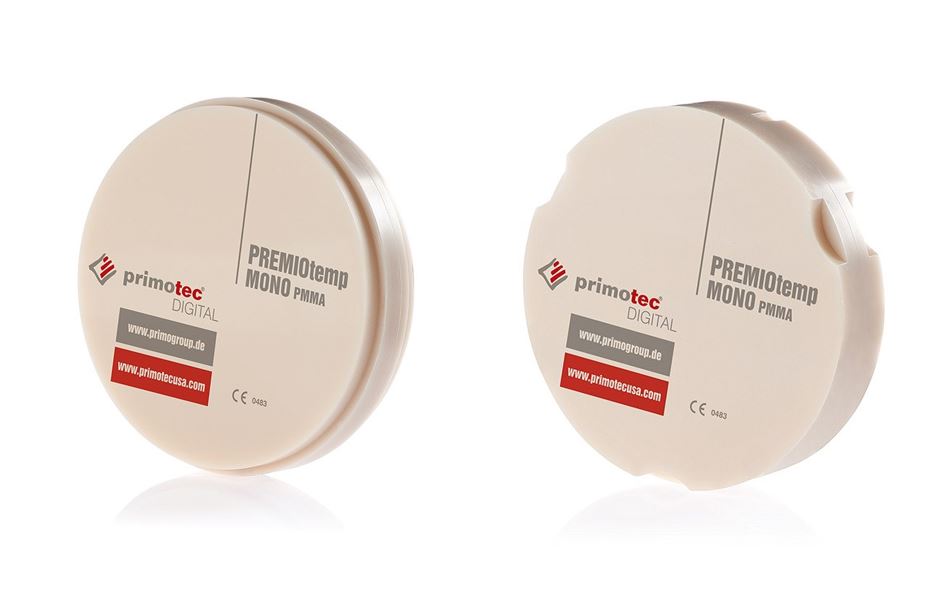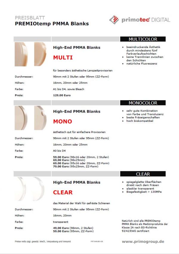 PREMIOtemp Blanks werden aus qualitativ hochwertigen PMMA (Polymethylmetacrylat) hergestellt. Zur Optimierung der Gitterstruktur sind spezielle Vernetzer und anorganische Bestandteile beigefügt. In Verbindung mit einem besonderen Polymerisations-Formpressverfahren werden die optimalen Materialeigenschaften der Blanks erreicht.