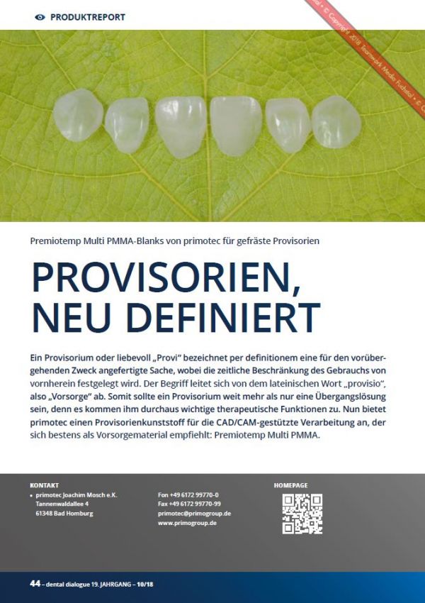 Damit ist das PREMIOtemp Material sowohl für zementierte als auch für verschraubte Langzeitprovisorien bestens geeignet.