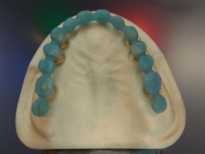 herausnehmbare Oberkieferbrücke auf Implantaten mit Galvano-Mesiostruktur