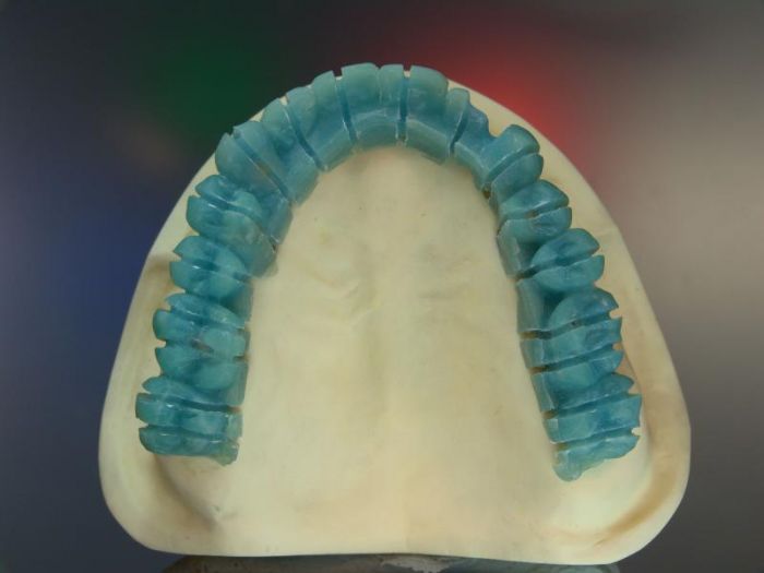 Das metacon System kombiniert auf ideale Weise Wachs- und Kunststoffanteile mit Fotoinitiatoren. So lässt sich das Material vor der Lichthärtung wie Wachs verarbeiten. Durch Polymerisation wird das metacon Wachs zu Kunststoff.