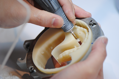 To remove the milled restoration from the PREMIOtemp PMMA milling blank, the holding sprues are cut off with a fine cross-cut tungsten carbide bur.